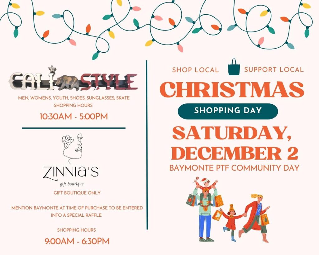 PTF’s next Community Day is right around the corner! Come out on Saturday to support some local businesses. Zinnia’s and Cali Style will both be donating a portion of the day’s proceeds back to Baymonte. Stop by and do some Christmas shopping!