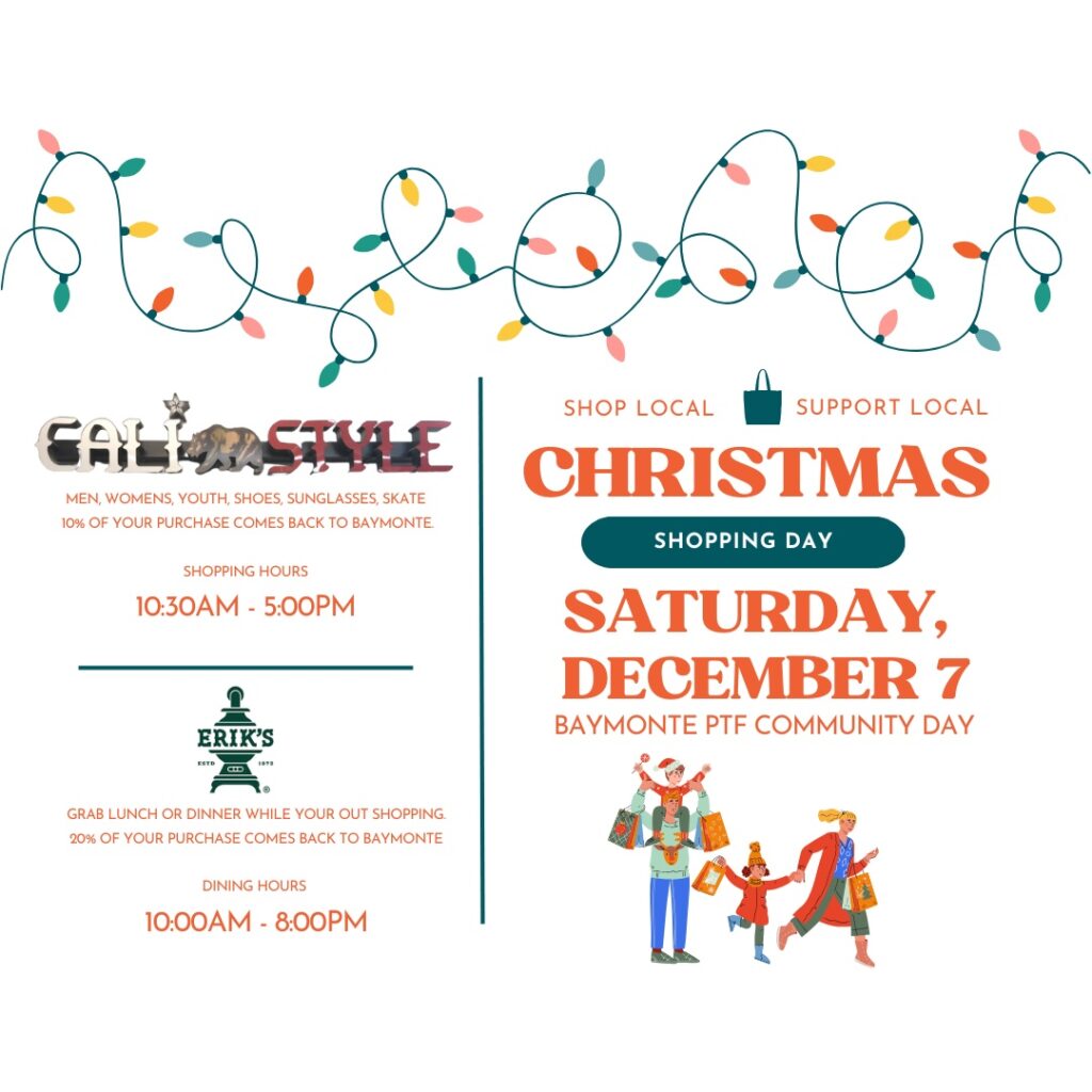 Plan a fun day of Christmas shopping and support local businesses and Baymonte at the same time! Start your day at Cali Style to pick up favorite skate and surf brands for the whole family, and then head over to Erik’s Deli for a delicious lunch. Both businesses will be donating a percentage of their profits back to Baymonte. Bring your friends and be sure to spread the word!