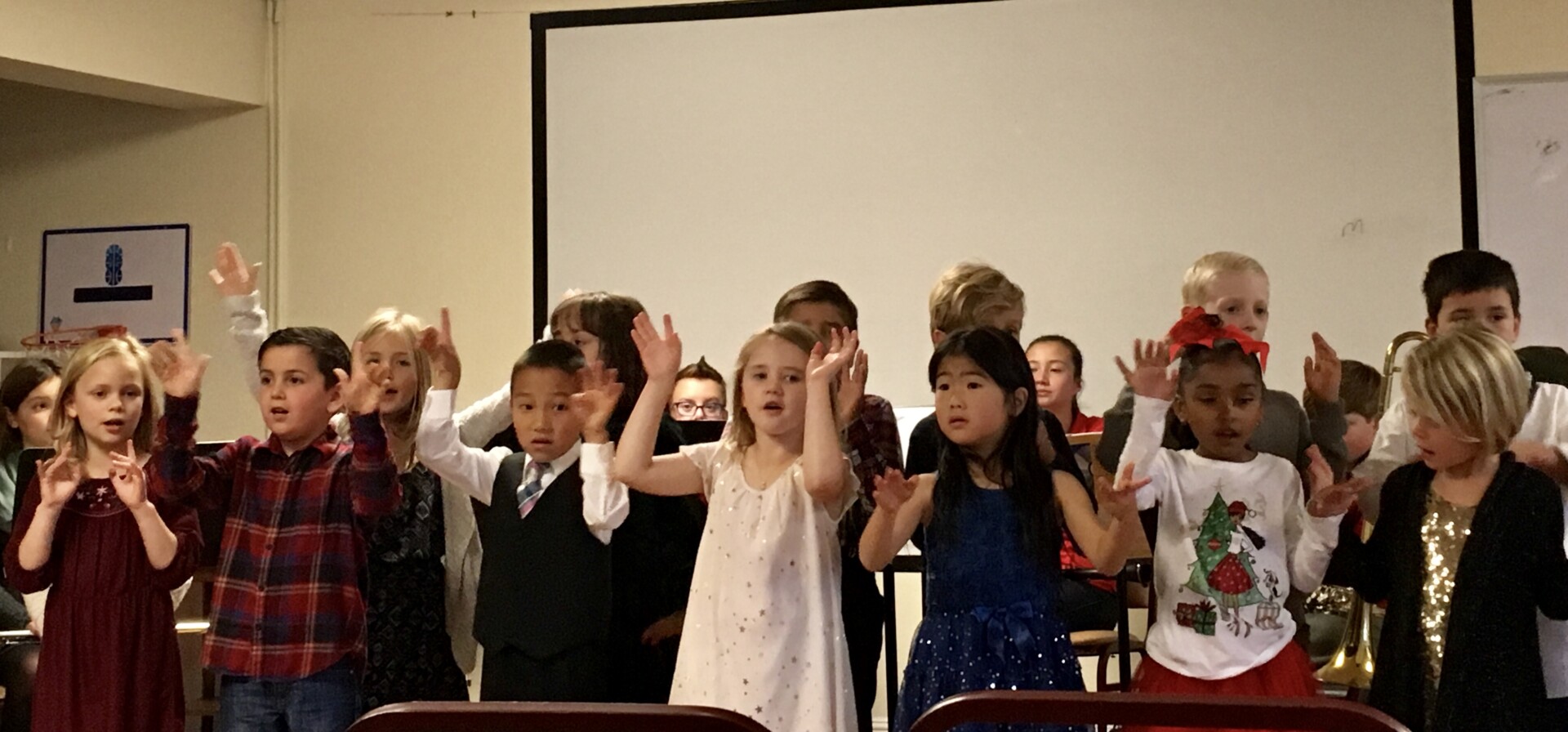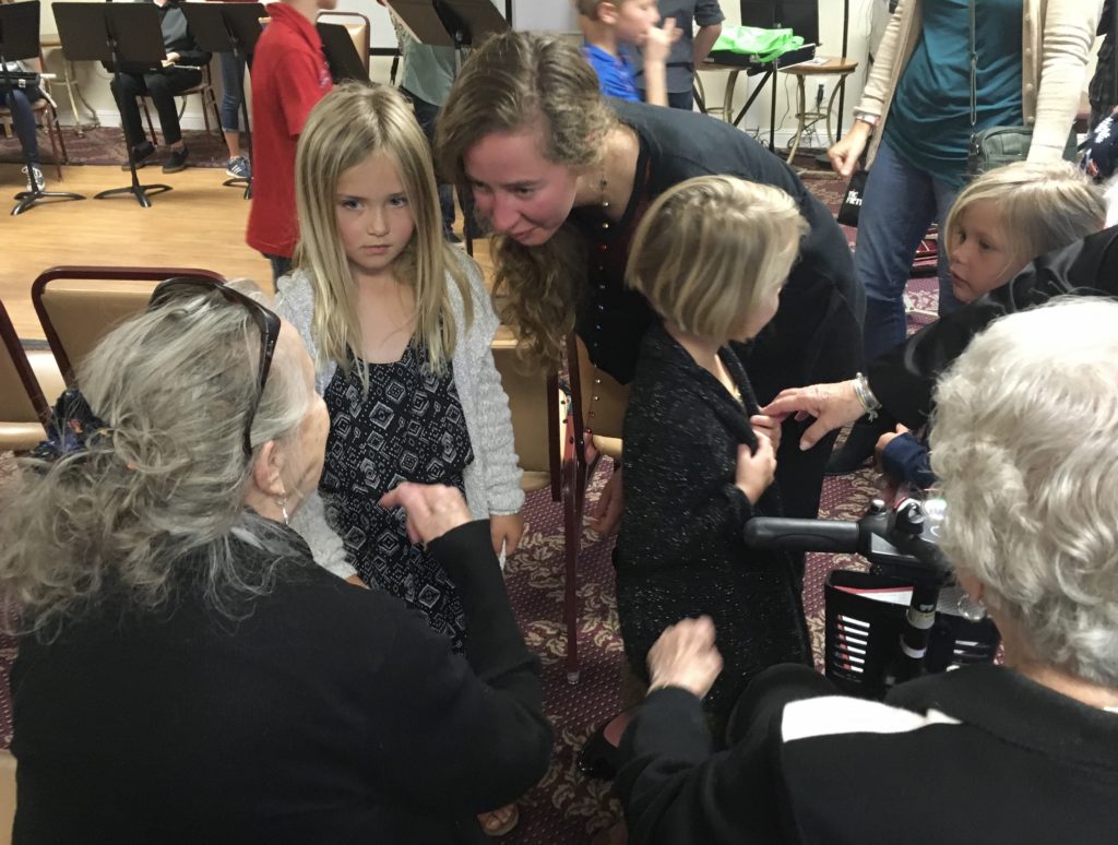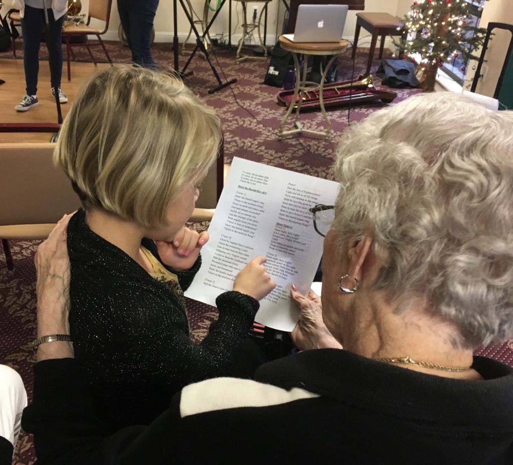 The Christmas-colored choir huddled in their “tall” and “short” line just off-stage. I told them they weren’t nervous but excited, encouraging them to smile as they shared their voices and their reindeer-Merry-Christmas-cards with the grey-haired audience waiting eagerly around the corner. I should have told them what my advance band talked about today as we debriefed this very same concert: good things come at a cost. Sometimes nervousness and willingness to put yourself out there is the first step to making a new friend. So, on they went. We brought our voices. The band brought instruments. We offered our tools and talents: song sheets, red and green construction paper, scales, embouchures… We brought tentative tries: “What’s your name?” “Without further ado, let’s welcome…” “Can I share lyrics with you?” God multiplied our musical offering into His harmony, a melody beyond what I could have imagined. I don’t think I’ll forget His orchestration of the last carol we sang together: Silent Night. I looked over at two hands holding firmly to the crisp page of lyrics, one wrinkled and unsteady, the other smooth and small. 70 and 7-year-olds lifted up their voices, “Son of God, Love’s Pure Light…”