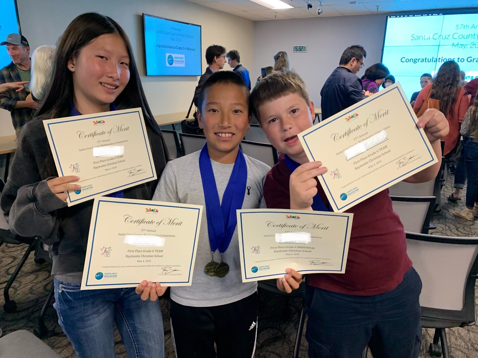Congratulations to these students who took home the top prize at the Santa Cruz County Mathematics Competition. They won first place for the Grade 6 Team Competition and also an individual first place. We are so proud of our young mathematicians!