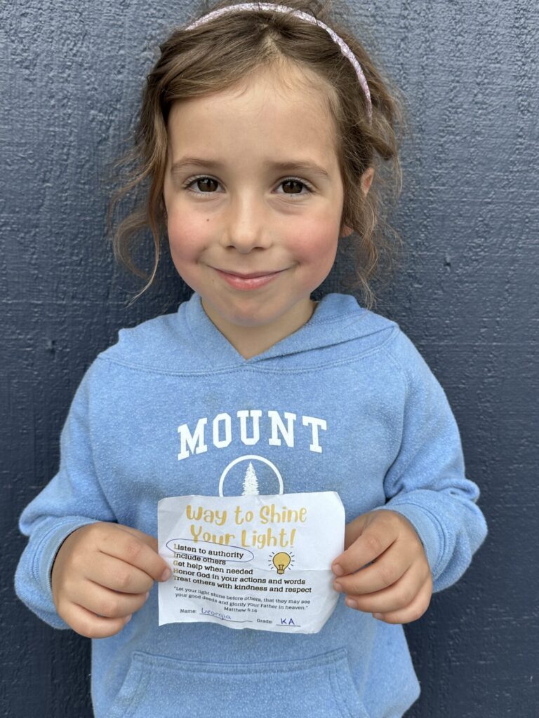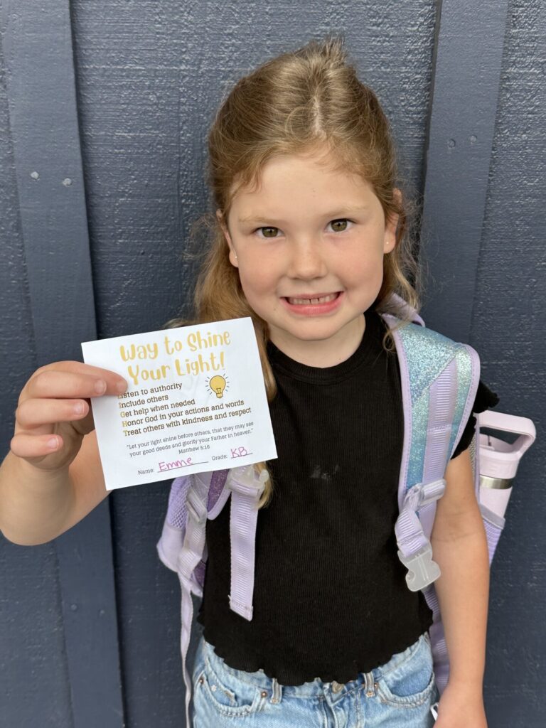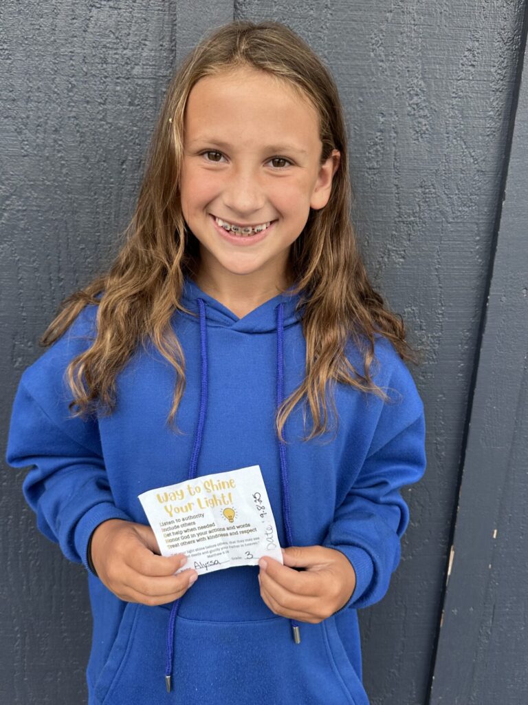 Our K-4 students who show exemplary behavior during recess, snack and lunch are eligible to be nominated for a “Shine Your Light” award. Congratulations to the winners for the week of September 8th: Emme F., Georgia L., and Alyssa K. Thank you for being a shining light on our campus!